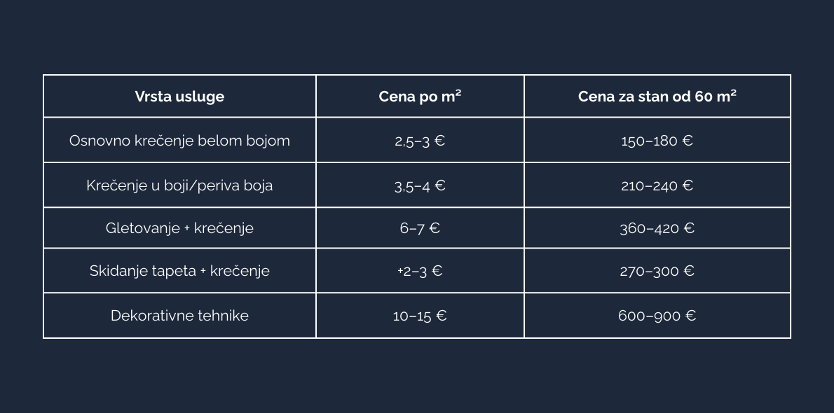 - Stan od 60 m² × 3 evra = oko 180 evra (osnovno krečenje, bele zidne boje, bez dodatnih radova).